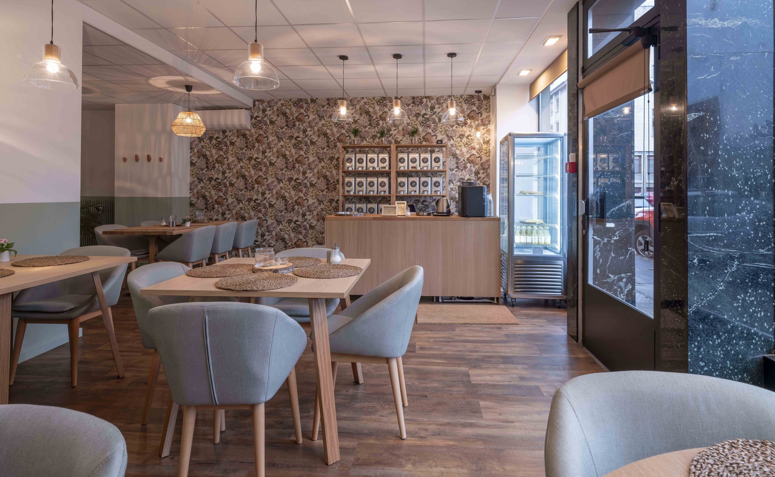 Aménagement d'un salon de thé avec une cuisine ouverte sur la salle de restauration